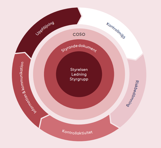I enlighet med aktiebolagslagen och Koden ansvarar styrelsen för att säkerställa att bolaget har väl utformad intern kontroll och goda processer på plats för att fastställa att bolagets finansiella och hållbarhetsrapportering kontrolleras på ett betryggande sätt. Den interna kontrollen inom Axfood är baserad på COSO-ramverket för intern kontroll vilket har anpassats till verksamheten. Ramverket utgörs av fem komponenter: kontrollmiljö, riskbedömning, kontrollaktiviteter, information och kommunikation samt uppföljning.